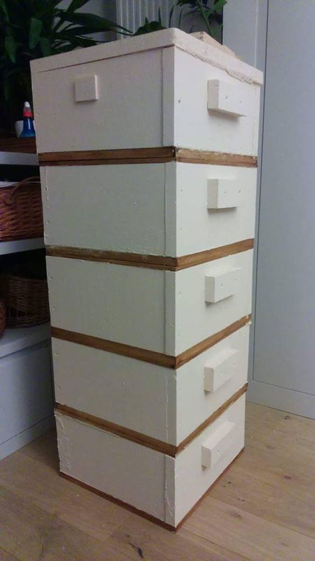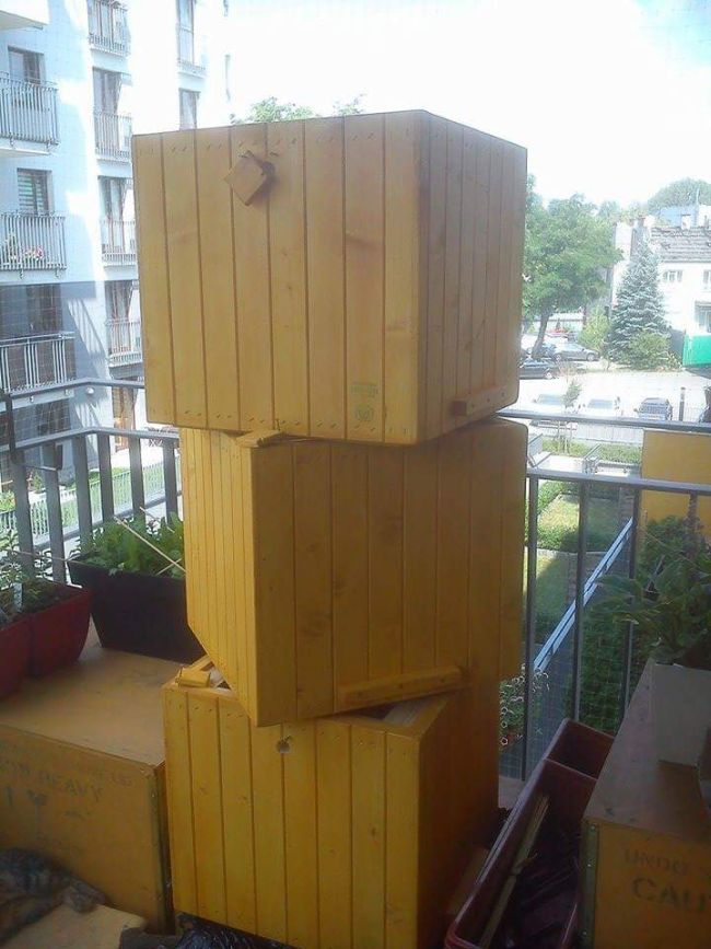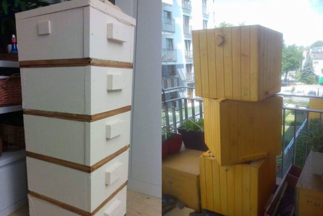 Trzy korpusy warszawskie poszerzane były drewniane, od Bartodzieja, malowane na żółto. Pozostałe trzy, daszki oraz korpusy Ostrowskiej to samoróbki, nad których stworzeniem pszczelarz spędził kilka nocy. Wykonane były z różowego styroduru 3 cm malowanego od zewnątrz na bladożółto. Wręgi od znanego i lubianego producenta z Biłograja.