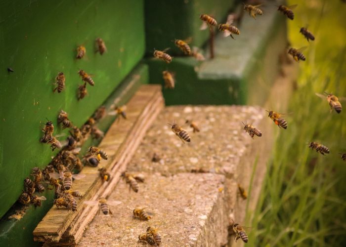Pszczoły zbieraczki lecące w stronę ula.