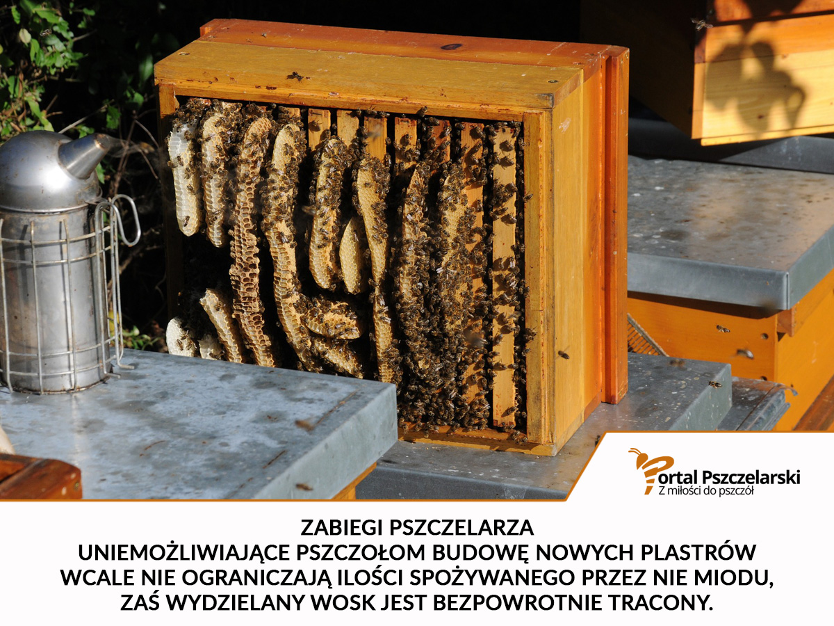 Zabiegi pszczelarza uniemożliwiające pszczołom budowę nowych plastrów wcale nie ograniczają ilości spożywanego przez nie miodu, zaś wydzielany wosk jest bezpowrotnie tracony.