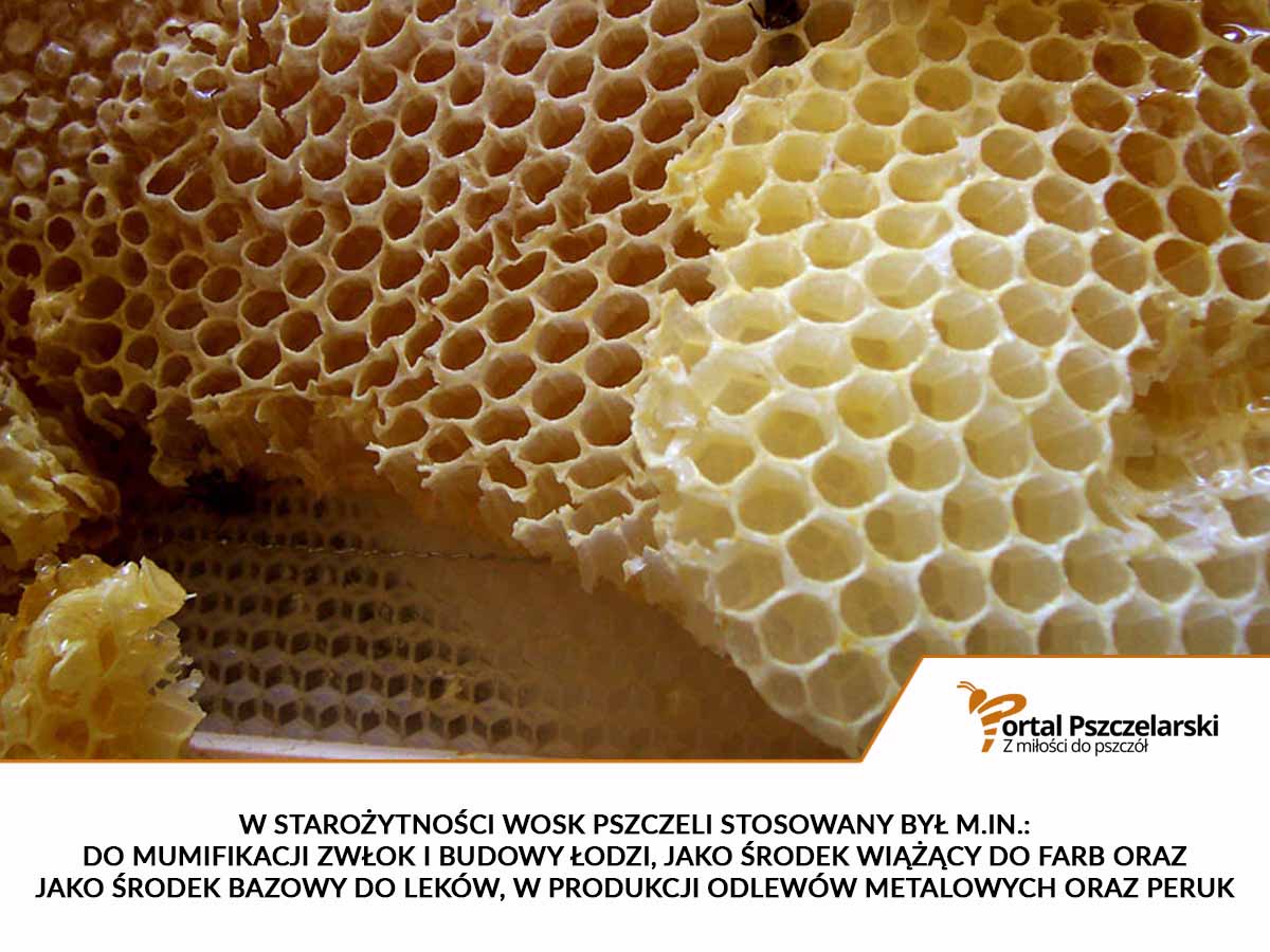 W starożytności wosk pszczeli stosowany był m.in. do mumifikacji zwłok i budowy łodzi, jako środek wiążący do farb oraz jako środek bazowy do leków, w produkcji odlewów metalowych oraz peruk.