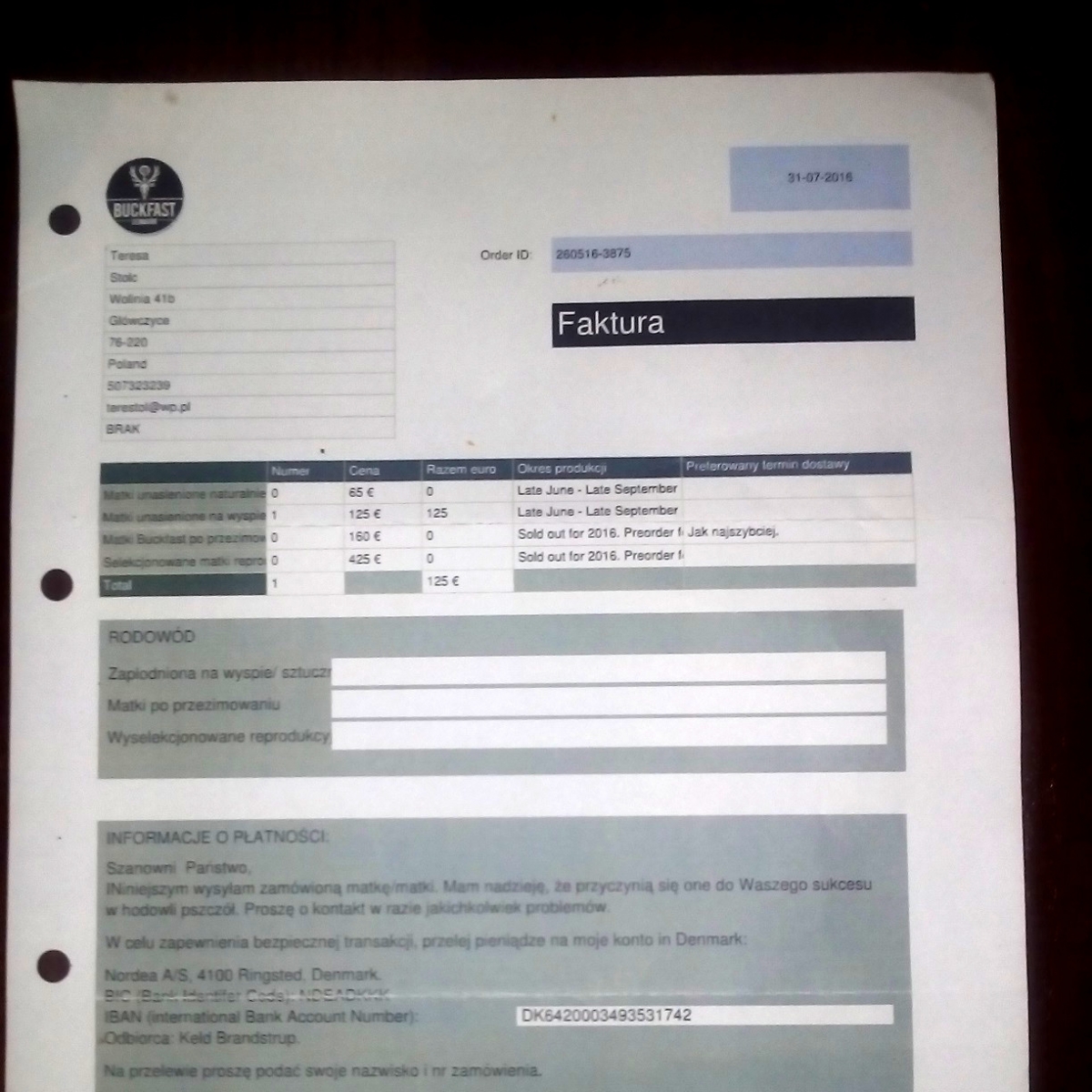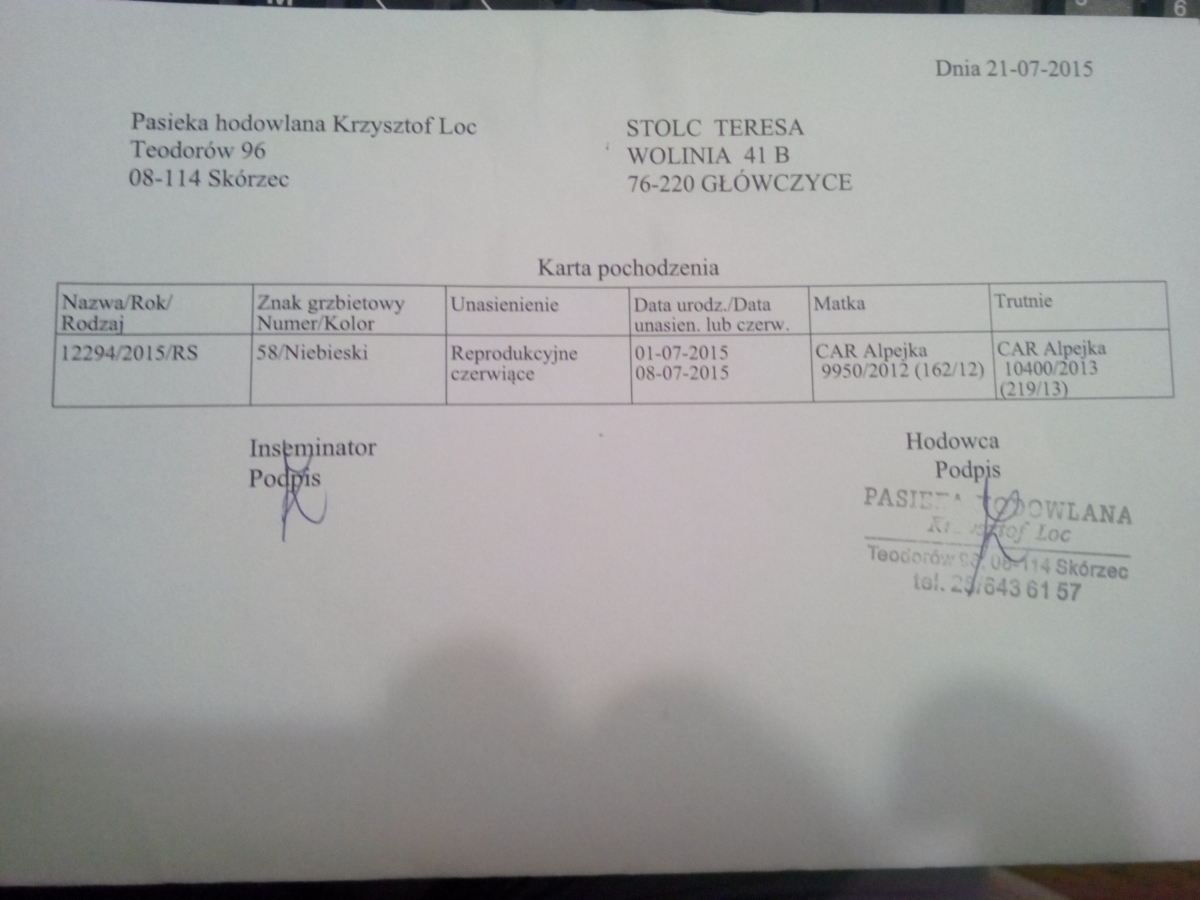 Hodowane przeze mnie matki pochodzą od matek reprodukcyjnych (czego dowodem są zdjęcia przedstawiające dokumenty zakupów). Dzięki temu, że bardzo silne rodziny wychowują maksymalnie 30 mateczników, sprzedawane przeze mnie matki są dorodne. Każda matka przed wysyłką przechodzi tz. test szklanki (matka musi wspiąć się po gładkiej szklance) dzięki temu mam pewność, że wysyłana matka ma sprawne wszystkie odnóża. Matki są oznakowane opalitką.
