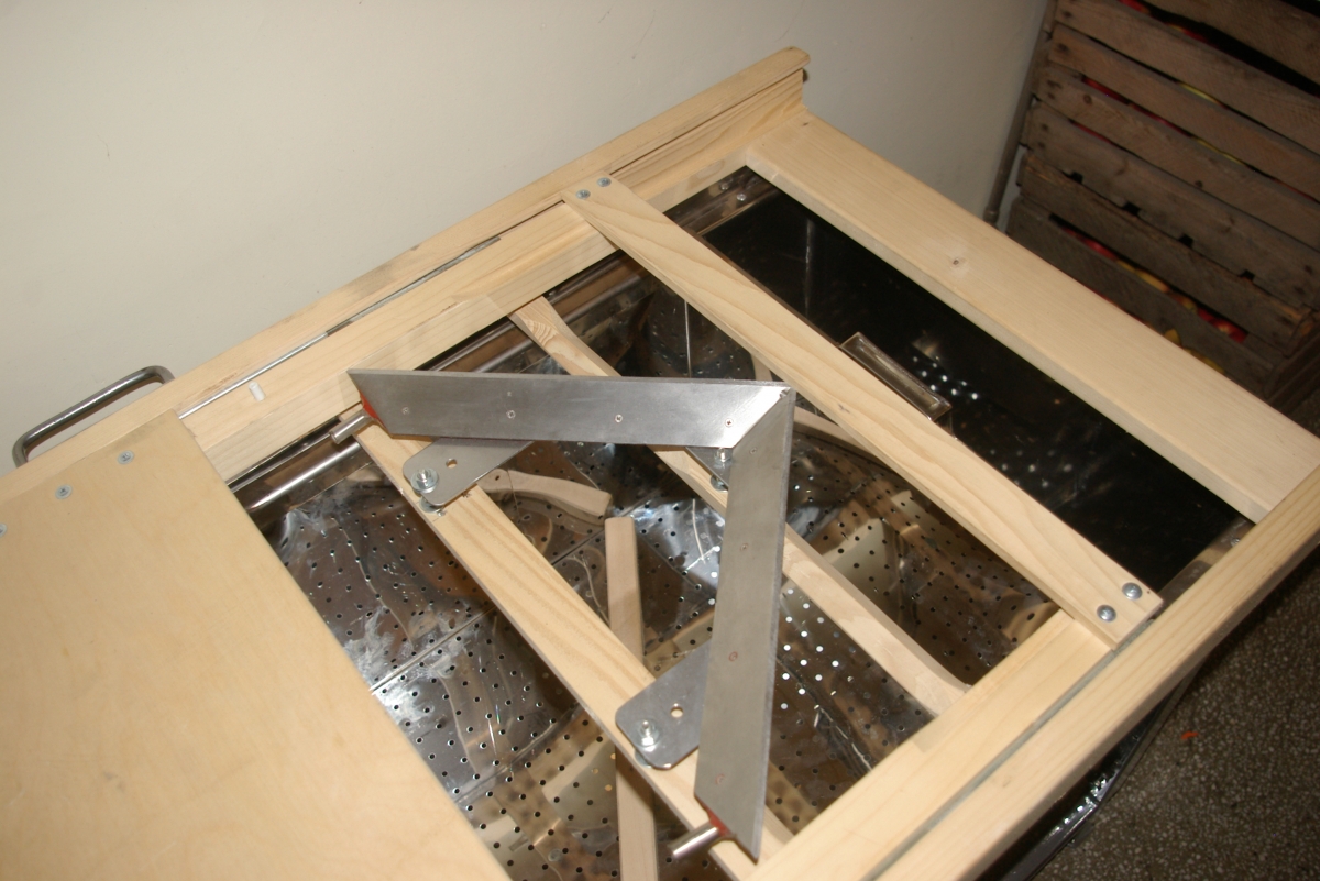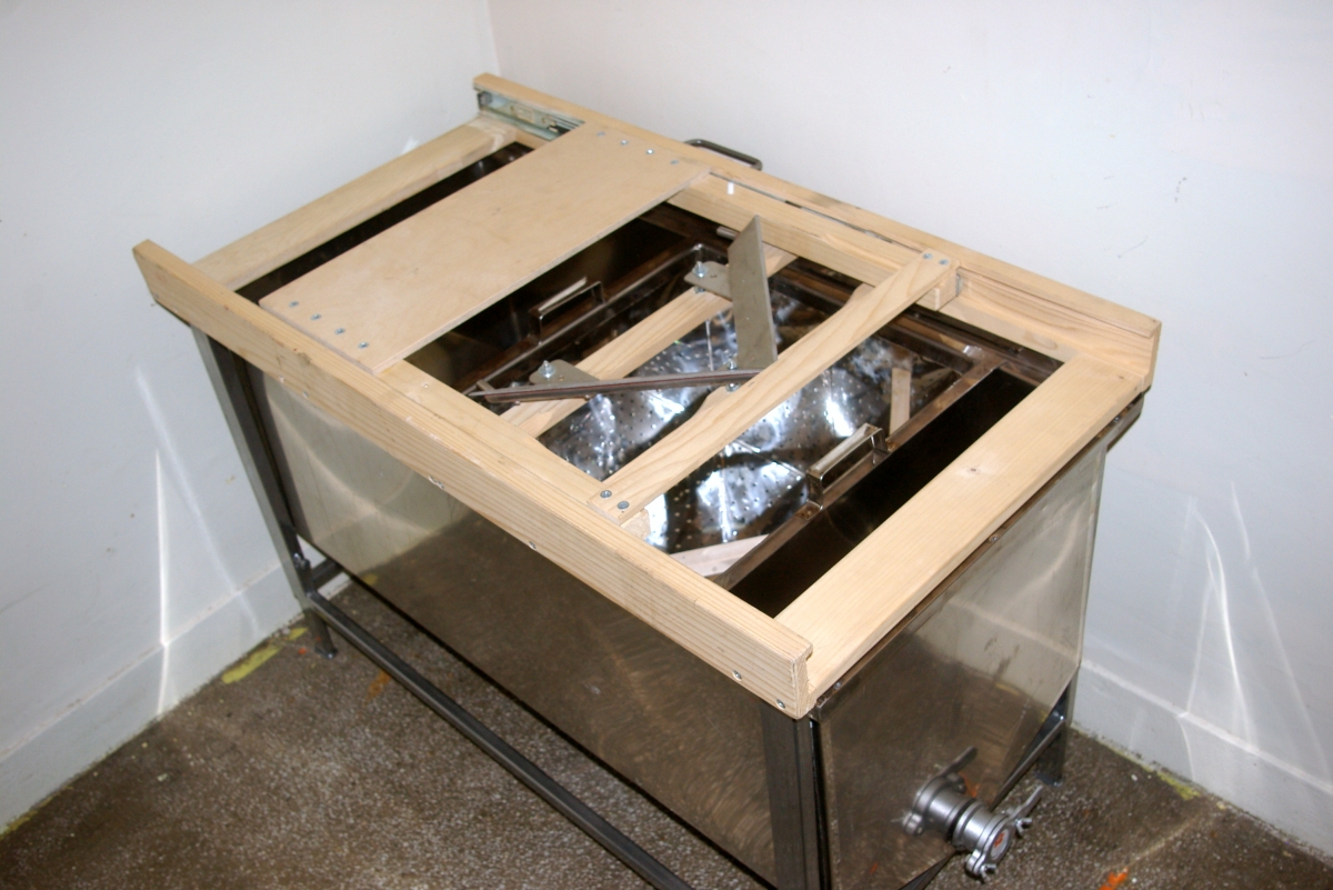 Oferuję zestaw stół do odsklepiania z koszem + nakładka z nożem klinowym. Stół jest wykonany ze stali nierdzewnej, dno trapezowe, wyciągany kosz ze stali nierdzewnej perforowanej, spust do miodu w dnie, nóżki regulowane. Do tego stelaż/nakładka drewniana z nożem klinowym parowym do odsklepiania ramek Dadant/Langstroth (takze hoffmanowskich)