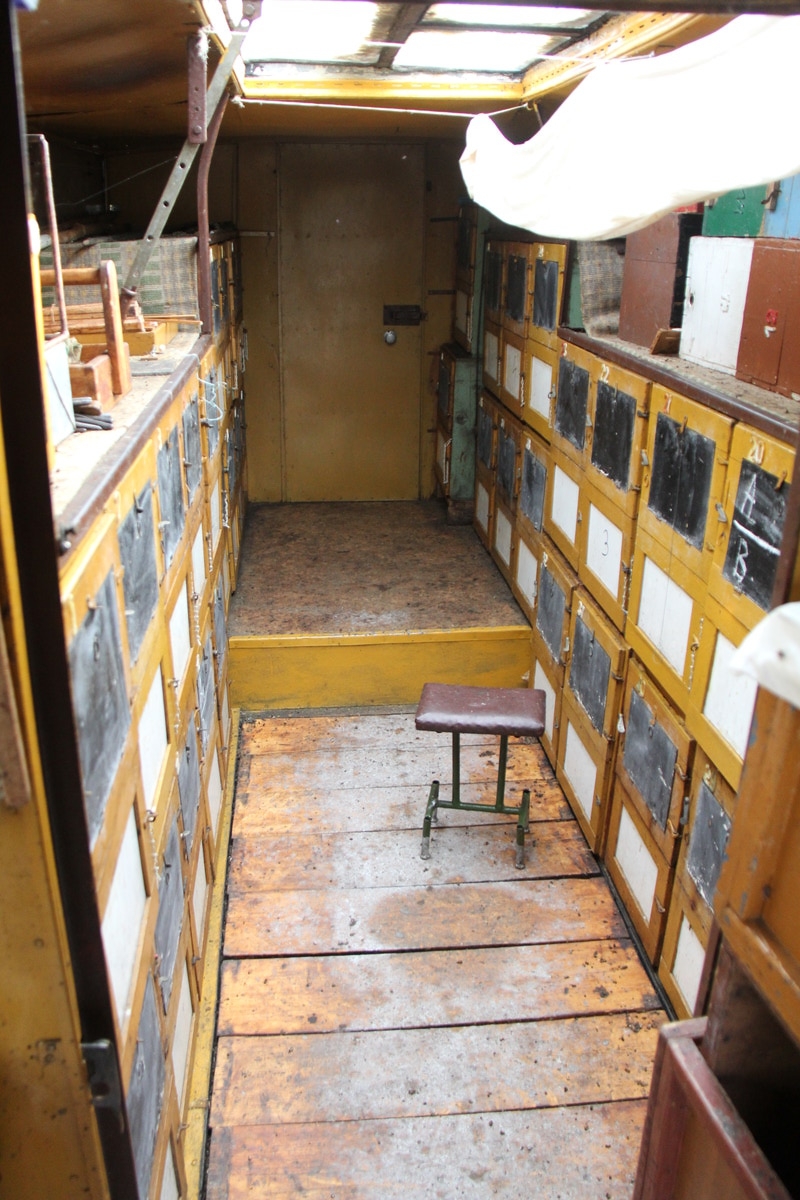 W wozie jest pracownia pasieczna, kanapa do noclegu i wypoczynku, kącik sanitarny oraz miodarka czteroplastrowa o napędzie ręcznym.