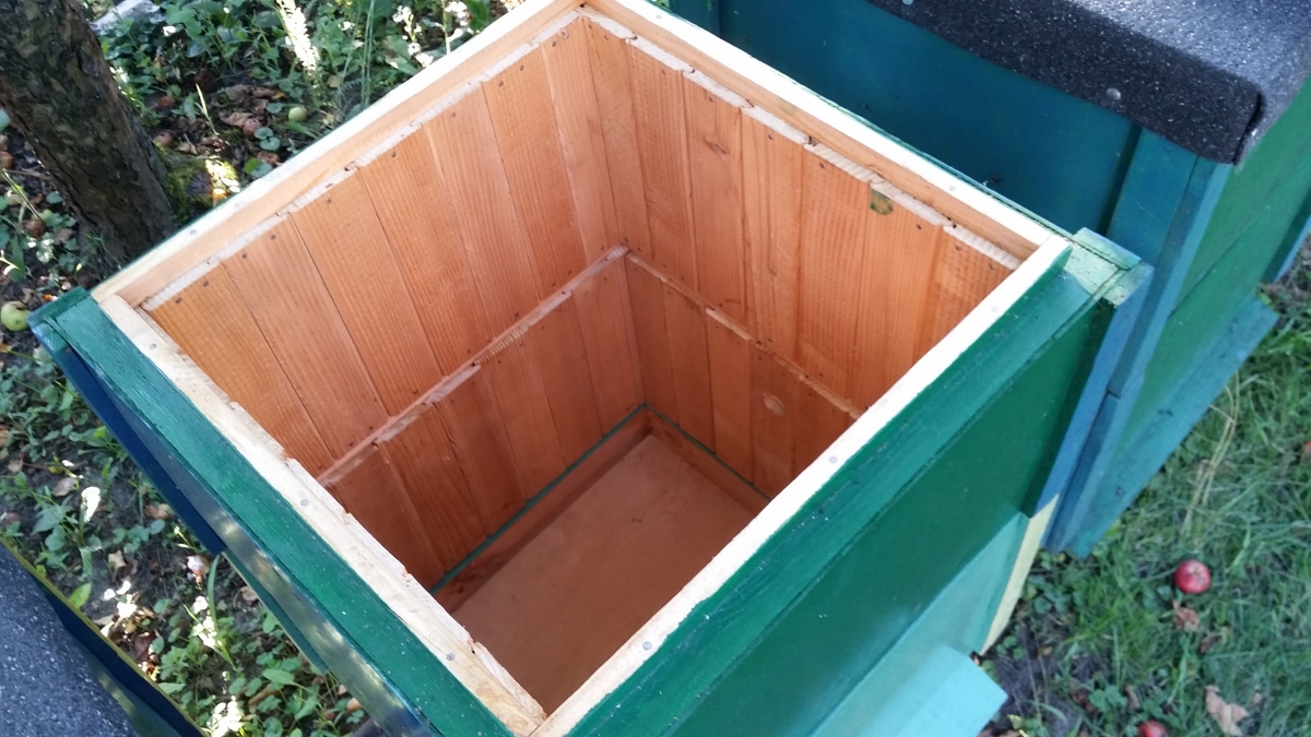 Wnętrze wykonane z deseczek świerkowych. Ocieplone 3 cm styropianem. Ściany zewnętrzne 0,5 cm wykonane z twardej płyty pilśniowej pomalowanej pokostem i dwa razy farbą.
