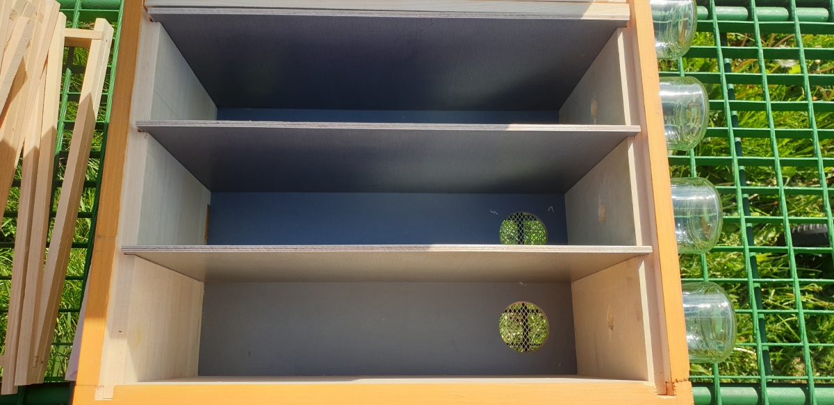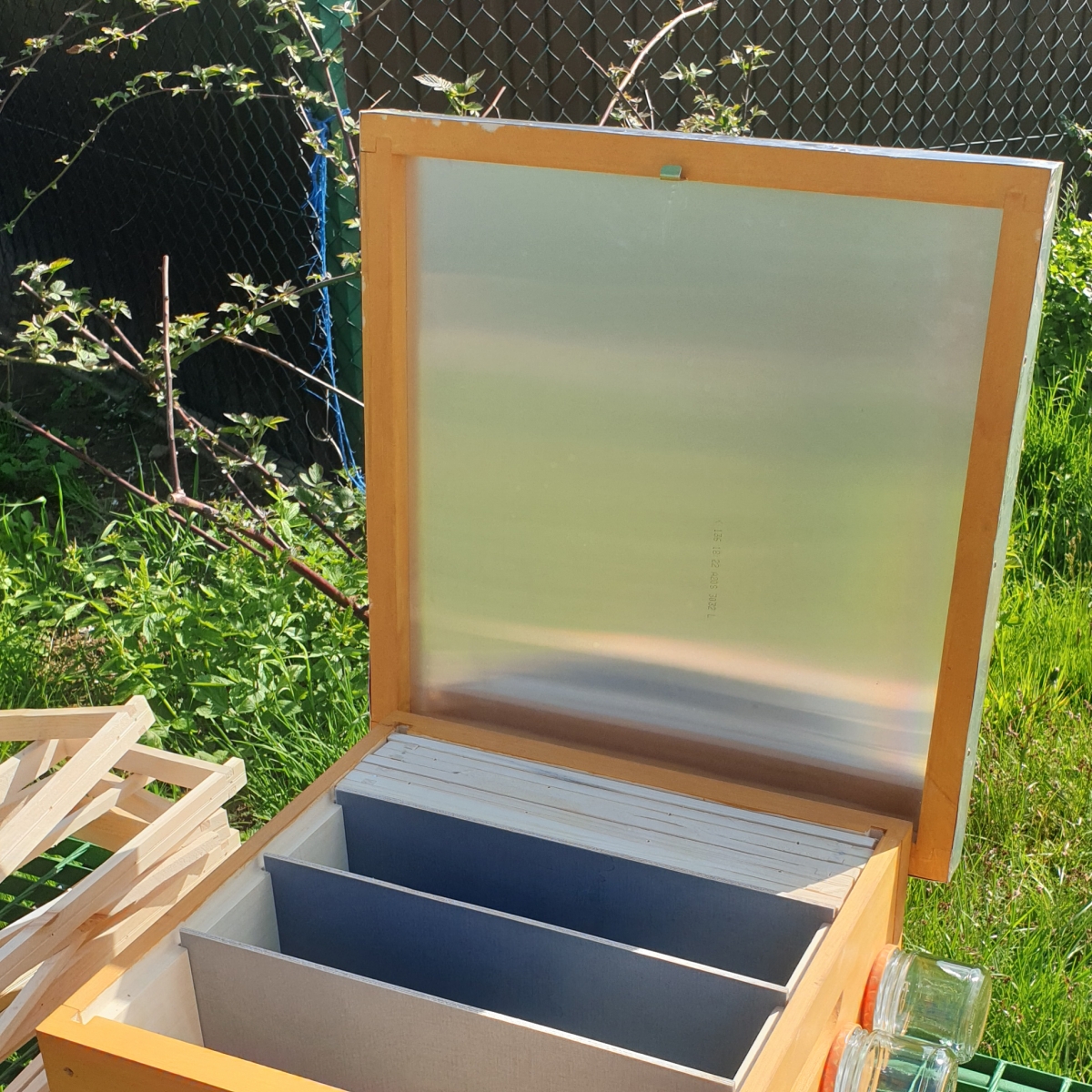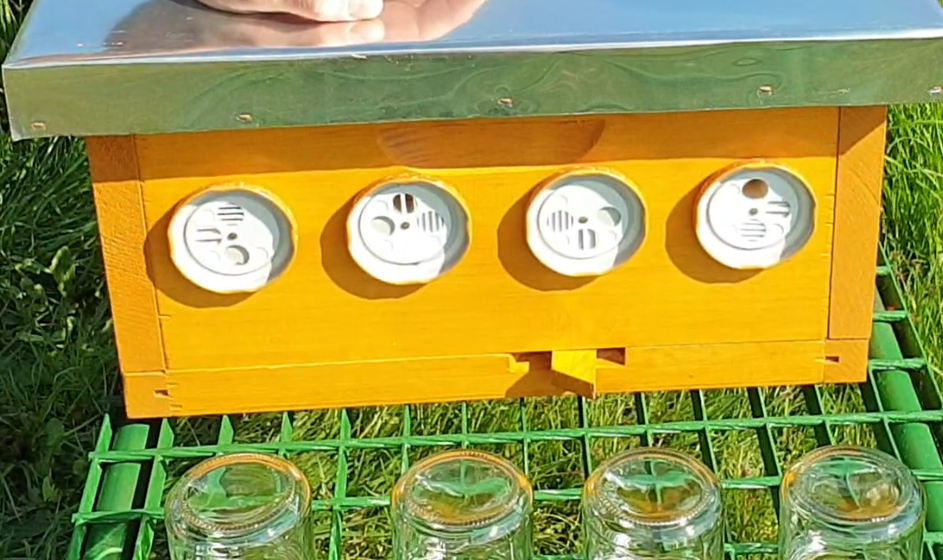 Ul weselny 4-rodzinny z możliwością podkarmiania. W każdej komorze mieszczą się 2 ramki 18-cm i 1 otwór wentylacyjny. Z każdej strony jest regulowany wylotek, który można zamknąć i mieć np 2 rodziny po 4 ramki, wyciągając przegrodę. Jest to bardzo praktyczne, umożliwia łączenie rodzinek w przypadku, gdy nie wszystkie matki się unasiennią. Ulik wykonany jest z sosny wejmutki, zabezpieczony podwójną warstwą środka ochronno-dekoracyjnego, który według producenta zapewnia 7 lat ochrony, wysoką trwałość i odporność na czynniki atmosferyczne (wodę, śnieg, wilgoć, słońce, promieniowanie UV) . Daszek ocieplony ( wygłuszony ) styrodurem, pokryty blachą offsetową (aluminiową) od środka i z zewnątrz, zamykany na klamerkę. Telefon 663 839 891 lub 739952831 Cena ulika z kompletem ramek 135 zł. Dostępne również identyczne uliki weselne na pełna ramkę wielkopolską ( 26cm ) w cenie 145 zł. Istnieje możliwość wysyłki : 19 zł przy wpłacie na konto, 25 zł za pobraniem.