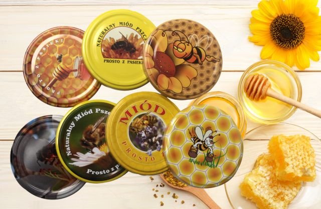 Duży wybór słoików oraz wieczek z motywem pszczelarskim.