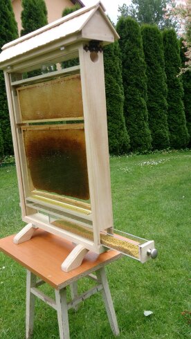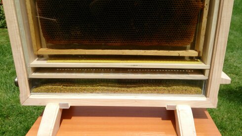 Z jednej strony szyba wysuwana aby wstawić ramki z pszczołami, osiatkowana dennica, poławiacz pyłku / szuflada na pyłek z plexi -wysuwana, aby wsypać pyłek na czas pokazu/, na powałce mini słoiczek jako pokaz dokarmiania pszczół. Ul na czas transportu zabezpieczany z dwóch stron osłonami co widać na zdjęciu. Pokazywany ul jest w wersji na 2 duże lub 1 duża i 2 małe ramki wielkopolskie ale mogę wykonać taki sam na dowolną ramkę