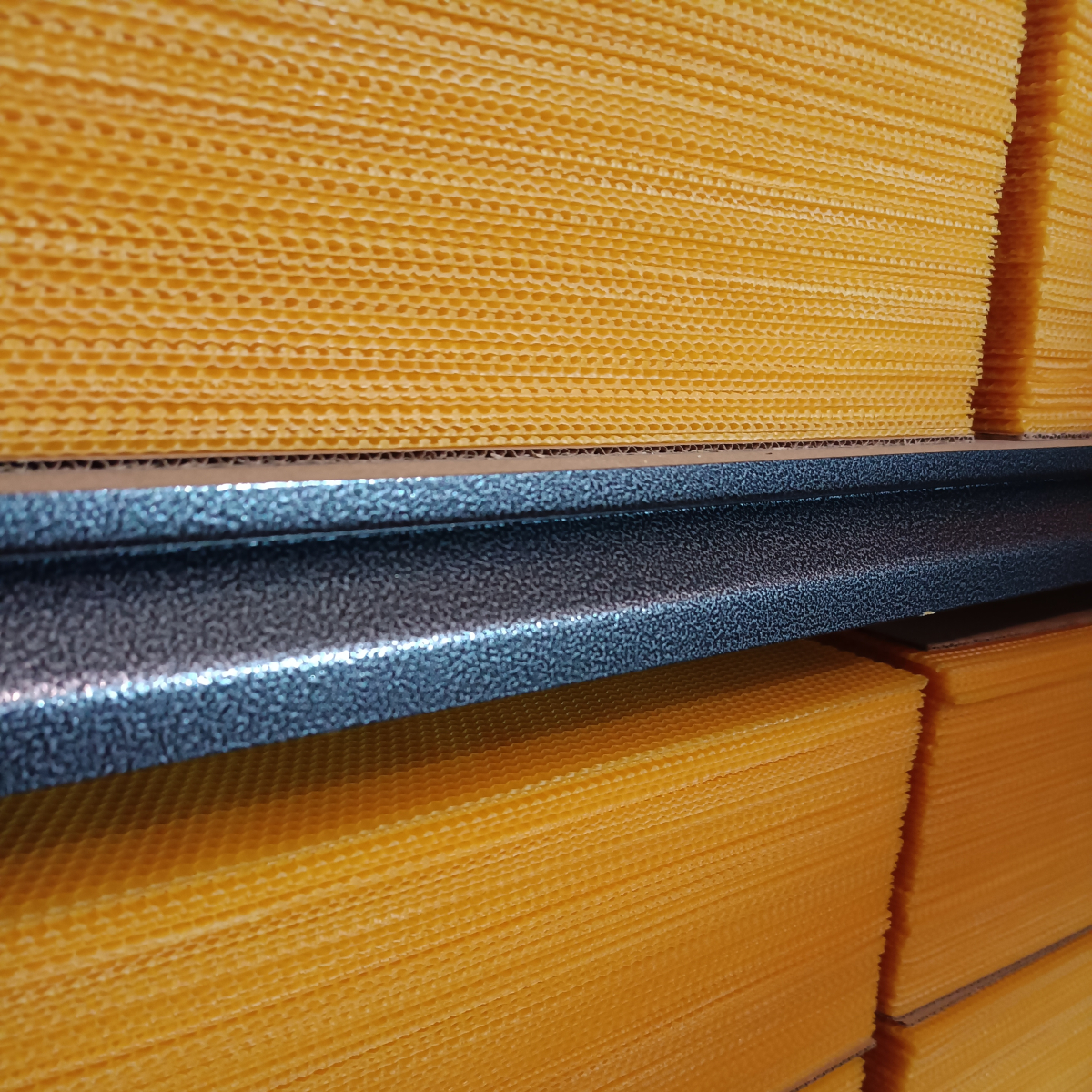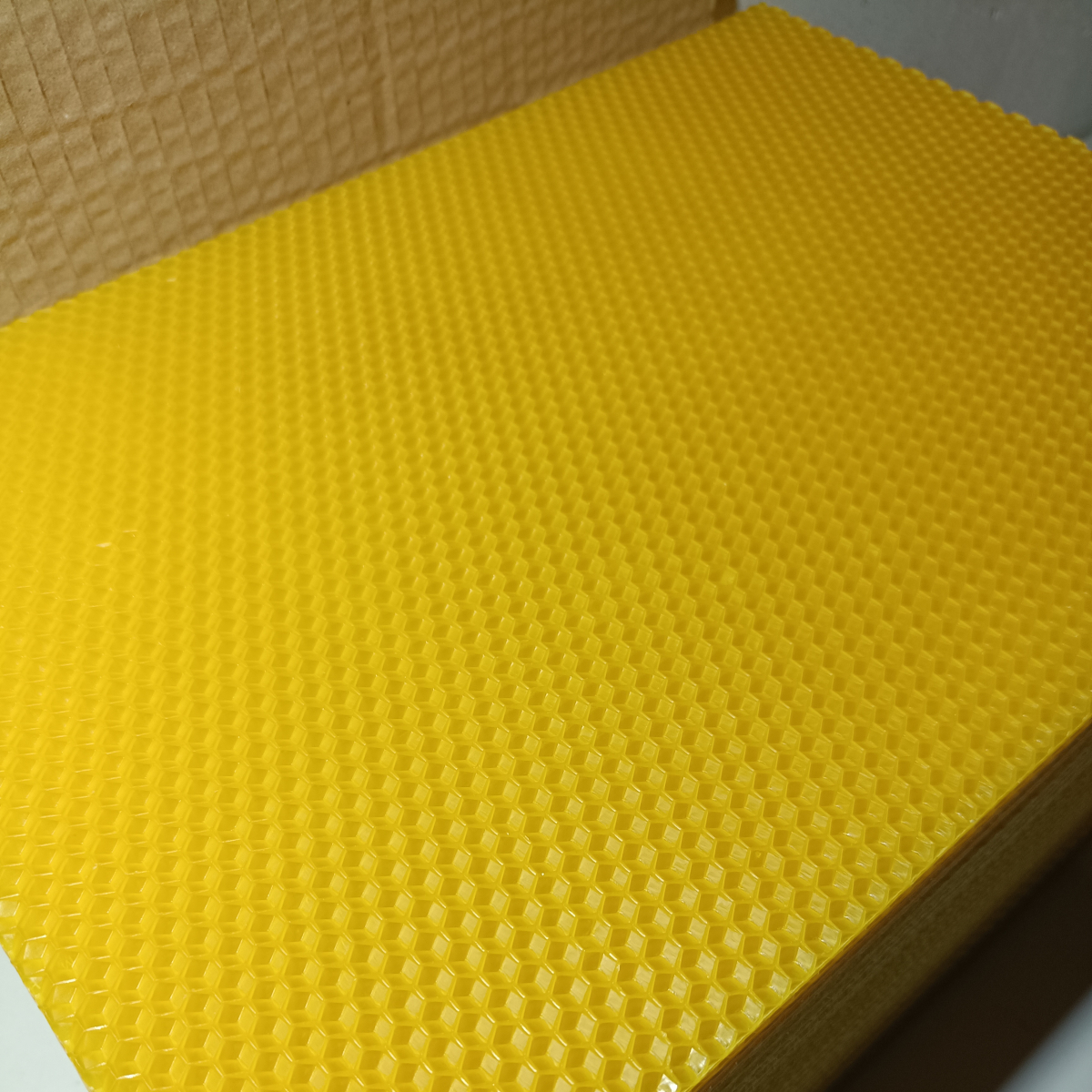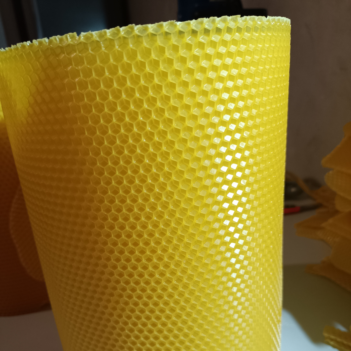 Powierzony wosk jest uprzednio sterylizowany w profesjonalnym autoklawie zgodnie z wymogami ustawy. Gwarantuje to całkowite pozbycie się przetrwalników zgnilca amerykańskiego. Węza o komórce 5,37. Wykonuję różne wymiary standardowe oraz nietypowe. Powierzony wosk nie jest mieszany z woskiem innych pszczelarzy. Wyrób metodą walcowania na zimno co gwarantuje wysoką elastyczność również w niskich temperaturach.